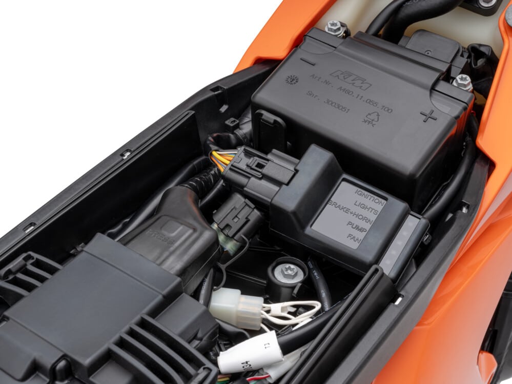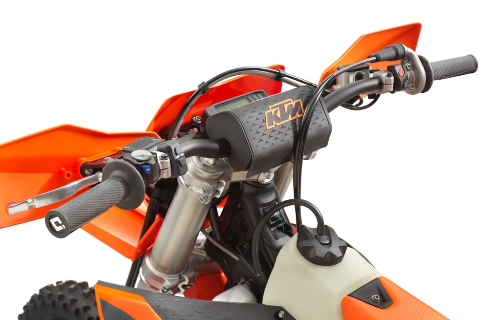 Am hinteren Ende sorgt das WP XPLOR PDS-Federbein mit neuen Einstellungen für eine verbesserte Druckbalance und geringeres Kavitation. Der Schwingarm erhält ein Update mit einer bearbeiteten Einheit, die die Haltbarkeit des Kettenschleifers verbessert. An der Vorderseite sorgt eine neue Tankhalterung für eine festere Befestigung des Tanks und schützt gleichzeitig den Rahmen vor Abnutzung. Am Lenker wird ein neuer Ein-/Ausschalter aus der KTM SX-Reihe übernommen.