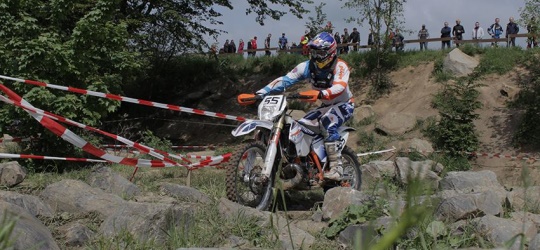 Zur Qualifikation am Vormittag waren die Steine noch feucht und dementsprechend rutschig. Das brachte sogar die angereisten Topfahrer wie Wade Young ins Straucheln und machte die Jagd nach einer schnellen Rundenzeit extrem spannend. Neben Wade Young stand das „who is who“ der deutschen Enduro und Endurocross Szene am Start, was für unterhaltsame Finalrennen sorgen sollte. Kurz vor dem Start des A-Finales stieg die Spannung weiter, als Wade Young überraschend seinen Startplatz räumte und sich, als zusätzliche Herausforderung, in die zweite Reihe stellte. Dementsprechend schlecht kam er am Start weg und wurde in einen Crash verwickelt. Perfekt lief der Start dagegen für Robert Scharl vom Team MXtreme, der sich den Holeshot holte und von Anfang an Druck machte.