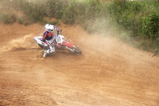 Im Schlepptau hatte er Mark Risse und Benny Menzel, die ihm nicht von den Fersen wichen, aber auch nicht näher ran kamen. Auf der Strecke mit Rundenzeiten um die drei Minuten waren im Finale sieben Runden zu absolvieren. Das lange Finale war ein Segen für Wade Young, der mit Abstand schnellster Fahrer auf der Strecke war. Wie eine Dampfwalze bahnte er sich seinen Weg an die Spitze. In Runde fünf war er auf Platz zwei vorgefahren und setzte im Steinfeld alles um die Lücke zu Robert Scharl zu schließen. Schulter an Schulter fuhren beide um die nächste Kurve. Im Ziel hieß der Gewinner zwar wie erwartet Wade Young, der seiner Favoritenrolle damit gerecht wurde. Der Weg dahin war jedoch wesentlich steiniger und nervenaufreibender, als es dem sympathischen Südafrikaner lieb war. Robert Scharl konnte mit Platz zwei die Meisterschaftsführung übernehmen. Mark Risse vom MSC Werl fuhr ein starkes Finale und landete mit Platz drei auf dem Podium. Knapp dahinter kamen die Meisterschaftsanwärter Jan Peters, Benny Menzel und Busty Wolter ins Ziel. Jens Hurlebaus fuhr das erste Rennen nach einer Verletzungspause und holte, mit Platz acht, wichtige Punkte im Kampf um die Meisterschaft.