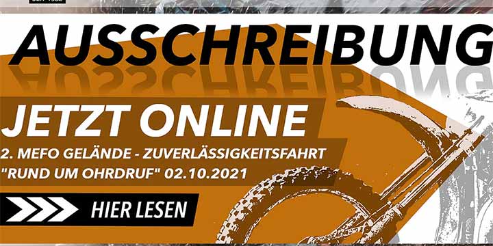 Am 02. Oktober 2021 findet die 2. MEFO Gelände-Zuverlässigkeitsfahrt “ Rund um Ohrdruf “ statt. Geplant ist eine klassische Endurosportveranstaltung für zugelassene und historische Geländesportmotorräder bis einschließlich Baujahr 1990. Insgesamt werden 150 Starter zugelassen.