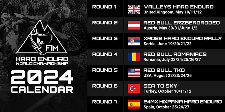 Für 2024 wird die FIM Hard Enduro Junioren-Weltmeisterschaft, unterstützt von KLIM, über fünf Runden ausgetragen. Die Veranstaltungen „Valleys Hard Enduro“, „Red Bull Erzbergrodeo“, „Xross Hard Enduro Rally“, „Red Bull Romaniacs“ und „24MX Hixpania Hard Enduro“ werden spannende Juniorenklassen-Kämpfe beherbergen.