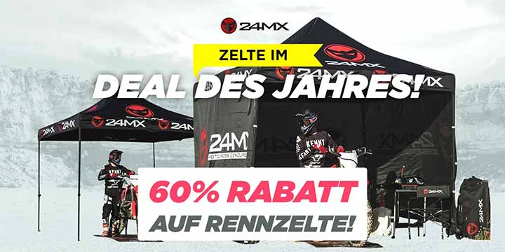 Mittlerweile sollte fast jeder die Rennzelte von 24MX kennen. Jetzt startet wieder die Aktion mit den günstigen Angeboten und so ist das 24MX Zelt für nur 69.99 Euro zu bekommen.