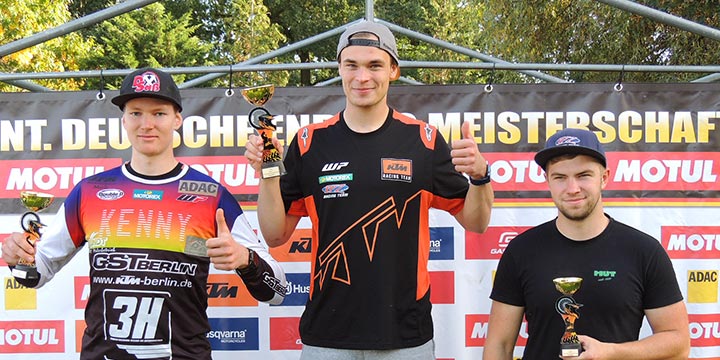 Für Sirko Bühnemann, der nur 40 Kilometer von Burg entfernt wohnt, war dieser Sieg der bisher größte Erfolg seiner Karriere. Dabei begann der Tag für ihn alles andere als optimal. „Mir ist im ersten Test der Motor ausgeploppt und ich bin über den Lenker gegangen“, erzählt Bühnemann. Doch er ließ sich nicht unterkriegen und gewann die weiteren fünf Prüfungen souverän vor Dirk Peter und Mirko Gans. „Vielen Dank an alle, die mich unterstützt haben, vor allem an mein Team“, so der frischgebackene Senioren-Champion, der mit einer großen Sektdusche und viel Applaus gefeiert wurde.