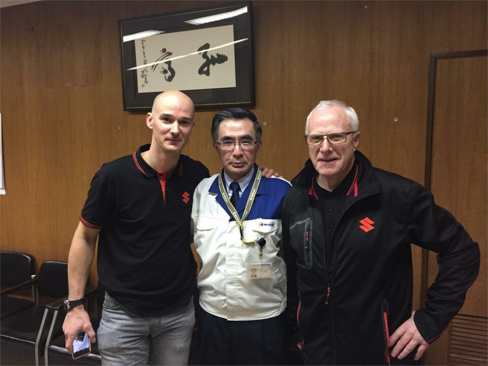 Trotz des eher mageren Saisonauftakts für das Suzuki-Werksteam hat man die Hoffnung auf schnelle Besserung keinesfalls aufgegeben. Zur Erinnerung: Die Werksfahrer Ben Townley und Kevin Strijbos mussten in Katar einen üblen Rückschlag hinnehmen. Während Townley beim Start zum ersten Lauf in das Startgatter fuhr und das Rennen damit faktisch gelaufen war, konnte auch Strijbos nicht überzeugen. Hinzu gesellten sich noch technische Probleme in der Einführungsrunde zum zweiten Lauf an Townlays Maschine, die ihn zwangen auf das Ersatzbike umzusteigen. Teamchef Stefan Everts musste bei seinem Debüt daher einiges einstecken und sich fragen, was seine Jungs da eigentlich machen. Die Führungsriege des Suzuki MXGP Teams um Stefan Everts und Sylvain Geboers nutzte nun die Anreise zum MX-Grand-Prix in Thailand für einen Abstecher zum Suzuki Hauptsitz in Hamamatsu (Japan) um sich dort mit Suzuki President (COO) Toshihiro Suzuki zu treffen. Herr Suzuki hatte sich diesen Termin in seinem Kalender frei gehalten um die Manager des MXGP Teams zu treffen und ihnen für die vielen Siege der Vergangenheit zu danken und ihnen weiterhin viel Erfolg in der Zukunft zu wünschen.