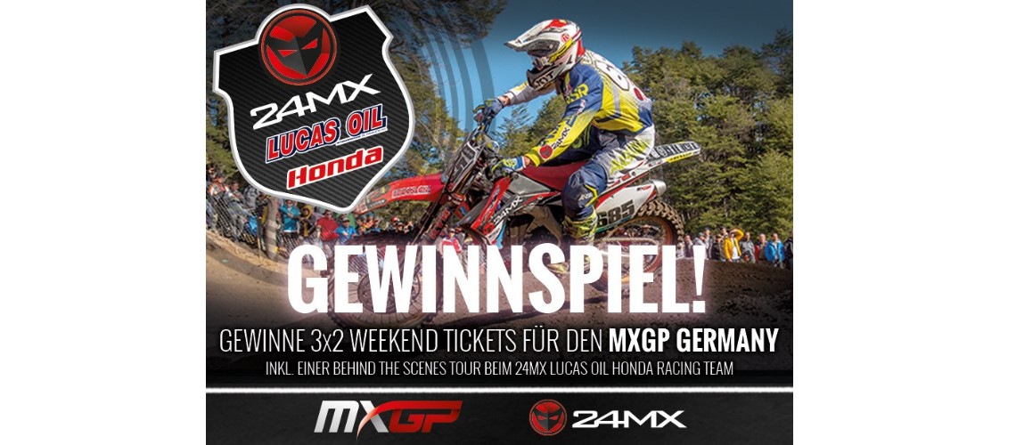 Erlebe den MXGP Germany hautnah und sehe, wie die weltweit besten MX Fahrer um wichtige Meisterschaftspunkte kämpfen. Gewinne nun mit 24MX 3×2 Wochenendtickets inklusive einer Behind the Scene Tour beim 24MX LucasOil Honda Racing Team am Sonntag. Zum Gewinnspiel >> https://a.pgtb.me/NVsN3W