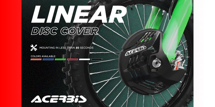 Kompatibel mit Bremsscheiben mit einem Durchmesser von bis zu 280 mm, ist der Acerbis Linear Bremsscheibenschutz ab sofort bei Acerbis-Händlern in 3 Varianten erhältlich. Diese passen auf die beliebtesten Motocross- und Enduro-Motorräder (Beta, Fantic, Gas Gas, Honda, Husqvarna, Kawasaki, KTM, Yamaha) und werden in 6 Farben (Schwarz, Weiß, Rot, Orange, Blau und Grün) zum Preis von 49,95 € angeboten.