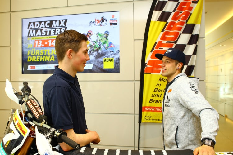 Wie es sich gehört, waren auch zwei der Hauptdarsteller vertreten. Zum einen der Clubfahrer des MSC Fürstlich Drehna, Maximilian Spies aus Ortrand, der im letzten Jahr, entsprechend seiner Lieblingsstartnummer, Siebenter im ADAC MX Junior Cup 125 wurde und diese Klasse nach nur einem Jahr in Richtung ADAC MX Youngster Cup, in dem mit doppelt so viel Hubraum gefahren wird, verlassen hat. „Ich bin inzwischen 1,89 oder 1,90 Meter groß und auch dementsprechend schwer, sodass ich mit der 125er wahrscheinlich nicht mehr viel hätte reißen können“, so der 15-Jährige. Und weiter: „Im Youngster Cup sind 250er Zwei- und Viertakter zugelassen. Ich denke, dass ich bei meinem Heimrennen, auf das ich mich schon tierisch freue, mit meiner Zweitakt-Husqvarna fahren werde, denn mit ihr rechne ich mir auf der Tiefsand-Strecke etwas mehr aus.“