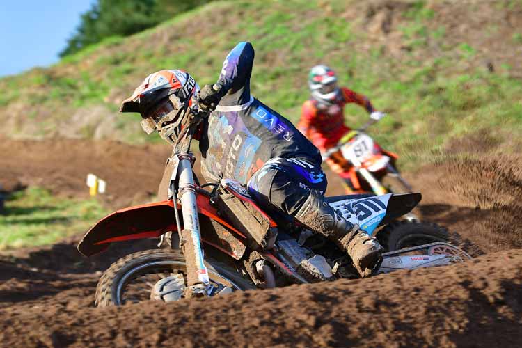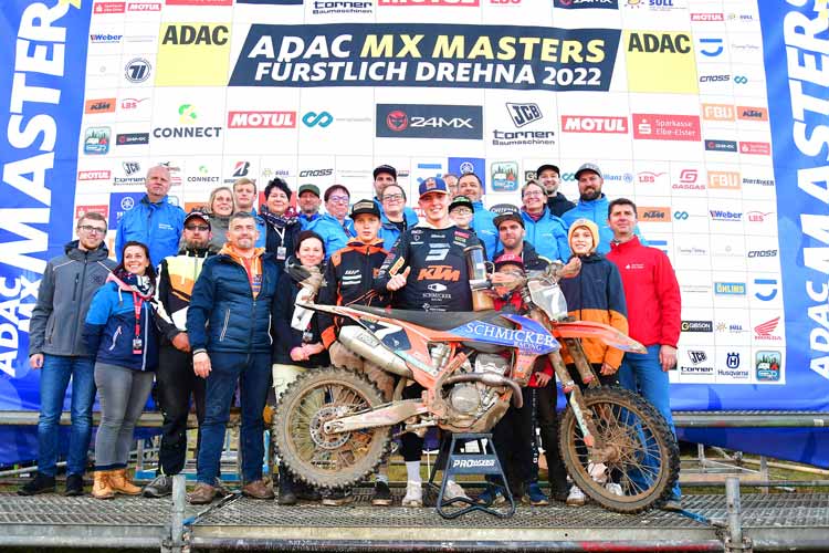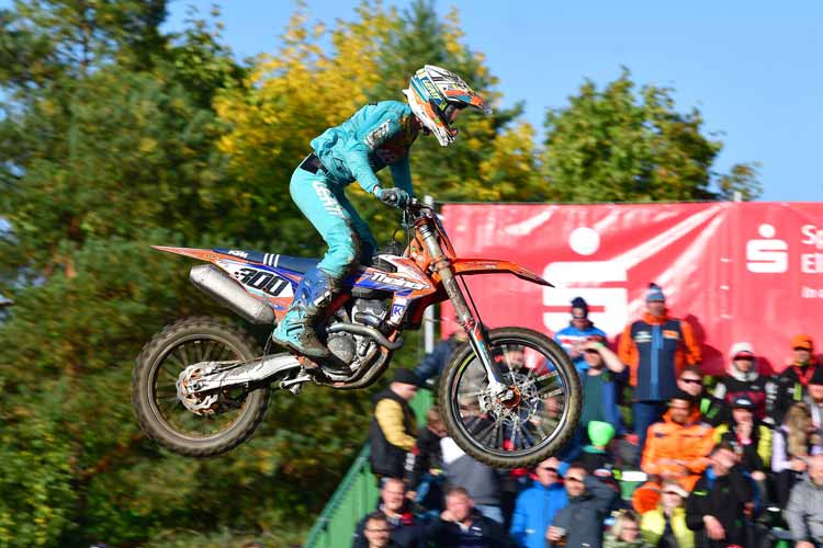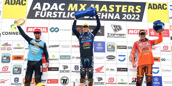 Einen schönen Abschluss wollte auch Maximilian Spies aus Ortrand im ADAC MX Youngster Cup haben und tat auch alles dafür. So gewann er, wie am Samstag den ersten Lauf, auch den zweiten und war damit auf einem guten Weg, den Gesamtsieg bei seinem Heimrennen zu holen. Mit einer vom Regen hinterspülten Brille und infolgedessen schlechter Sicht beim dritten und entscheidenden Heat kam er nur auf dem siebenten Platz ins Ziel. Damit landete er hinter dem dreifachen Laufzweiten, aber Fürstlich Drehnaer Gesamtsieger Noah Ludwig aus Aschersleben nur auf dem zweiten Podestplatz. Nach seinem Bad in der Menge sagte er: „Die Fans waren richtig geil, aber ich bin trotzdem traurig, dass das mit der Brille passiert ist und das es mit dem Heimsieg Overall nicht geklappt. Ich habe mich das ganze Wochenende super gefühlt, aber es sollte halt nicht sein. Ich bin aber trotzdem den Leuten sehr dankbar, die mich in diesem Jahr unterstützt haben. An sich war es schon ein sehr gutes Jahr, auch wenn die Ergebnisse, so wie hier, nicht immer gepasst haben und ab und zu was schief gelaufen ist. Das Leben geht aber weiter und nun freue ich mich aufs nächste Jahr, dann mit einer 450er in der Masters-Klasse sowie bei den europäischen MXGP-Läufen.“