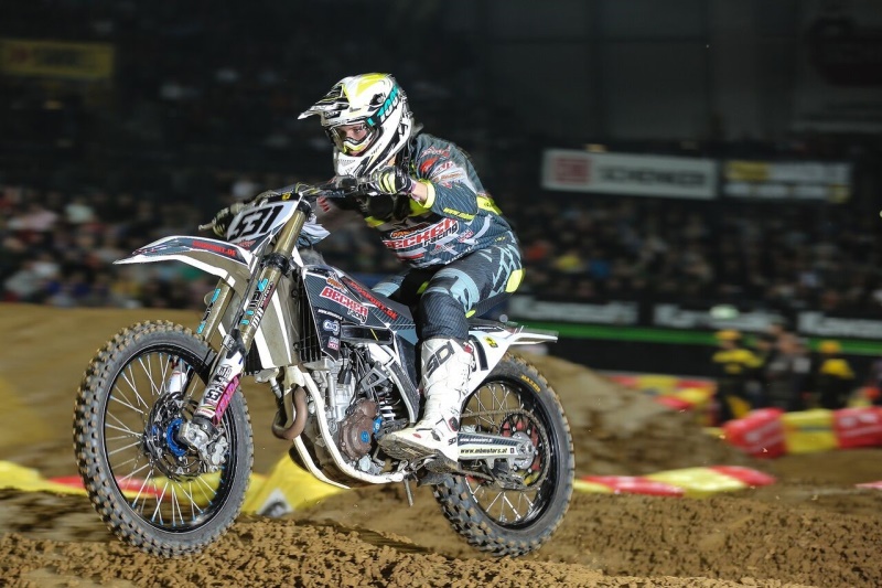 Eine Armada an internationalen Piloten rollte ans Startgatter des 35. ADAC Supercross in der ausverkauften Stuttgarter Hanns Martin Schleyer Halle. Neben einer starken Truppe Franzosen, einigen US-Boys, Fahrern aus Neuseeland, Großbritannien, Spanien, Italien und natürlich Deutschland, stand auch ein rot-weiß-roter Recke im Flutlichtspektakel von Stuttgart. Der Tiroler Florian Hellrigl wirft sich in den ADAC SX Cup 2017 und fand mit dem Becker Racing Team by Mefo Sport einen idealen Partner für dieses Vorhaben. An beiden Tagen stellt er seine MBmotors Bechter Husqvarna im Finale in die Top 10 und liegt in der Gesamtwertung der Klasse: SX2 als bester deutschsprachiger Fahrer nun auf Platz 6. Was leicht klingt, war ein steiniger Weg….. Am ersten Tag war erst einmal im Training antasten angesagt. Hatte Hellrigl doch genau hier in Stuttgart beim letztjährigen Antreten einen schweren Crash zu verzeichnen und diesen galt es zu verarbeiten. Im Zeittraining versäumte er knapp den Einzug ins Halbfinale und musste ins LCQ, das er nach harten Fights gewinnen konnte.