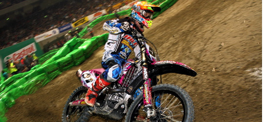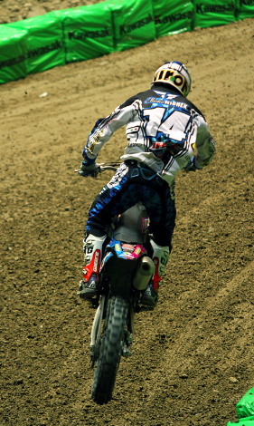 Zu guter Letzt noch Danny Neubauer, der in seiner zweiten SX-Saison nur ein einziges Ziel hatte: Die Qualifikation für die Finalläufe zu schaffen. Nach mehreren Anläufen in Stuttgart, Chemnitz und München sollte es beim letzten Event und am letzten Tag soweit sein: „Endlich habe ich es geschafft! Es hat zwar bis zum letzten Tag in dieser Saison gedauert, aber ich bin sehr froh darüber. Zunächst hatte ich so meine Probleme mit der Strecke, sie hat mir nicht gefallen und über den Triple wollte ich am Freitag auch noch nicht. Am Samstag ging es direkt im freien Training drüber, aber trotzdem nicht ins Abend- Programm. Heute hatte ich endlich das Glück, was mir bisher in den Quali-Rennen fehlte. Ich war lange Zeit Vierter, bis die zwei vor mir stürzten und ich mich qualifizieren konnte. Das in beiden Finalläufen nicht viel nach vorne geht war klar. Ich stand bei den Starts jeweils ganz innen, wo nach fünf Metern die Strohballen kamen. Das kann gut gehen, ist es aber nie und so hieß es für mich durchfahren und Erfahrung sammeln.“