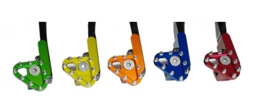 Gleiches leidiges Thema wie bei den Fußrasten. Beim anbremsen vom Hebel abgerutscht und den Anlieger nicht mehr so getroffen wie man es wollte. Für 109,90 € gibt es Abhilfe von KSX. Gerade bei älteren schon lange benutzen Fußbremspedalen rutscht man gerne mal von der Trittfläche. Der leichte und hochwertig gefertigter Aluminium Fußbremshebel verbessert nicht nur Ergonomie sondern soll auch eine enorme Steifigkeit dank des speziellen Designs haben und deswegen besser halten als Original. Highlight ist aber die Trittfläche mit Edelstahlspitzen, welche auch noch klappbar ist. So wiederrum kann der Hebel in tiefen Anliegerkurven, ähnlich wie die Fußrasten nach hintern wegklappen. Das tolle dabei, der Auftritt es ist als Ersatzteil erhältlich. Bei verscheiß muss nur der Klappmechanismus gewechselt werden. Für 49,00 € kann man das in 5 verschiedenen Farben nachordern.