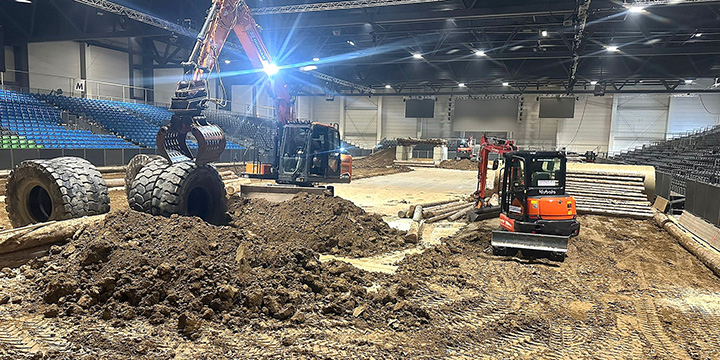 Das gesamte Team hat sogar an Silvester und Neujahr gearbeitet, um die rund 300 Meter lange Rennstrecke in der Arena rechtzeitig fertigzustellen. Hierbei kommen beeindruckende Materialien zum Einsatz: