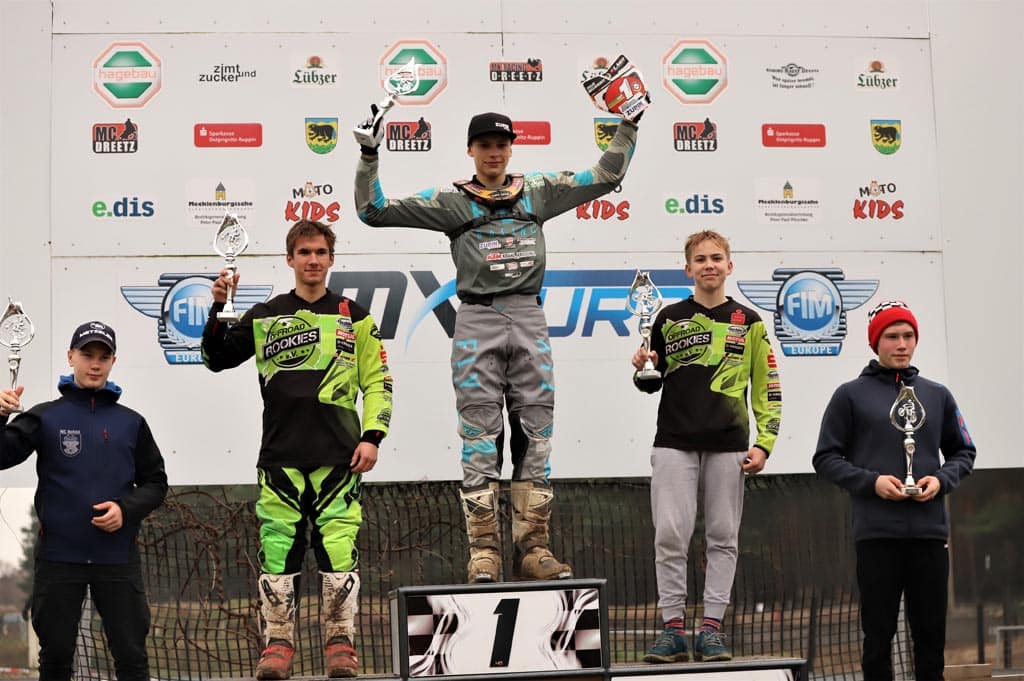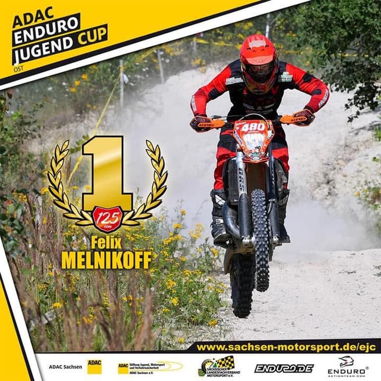 „Die Jugendkategorie 125 – „Königsklasse“ im ADAC Enduro Jugend Cup Ost, die Schwelle zum DMSB-Enduro-Cup. Wer hier vorn ist, empfiehlt sich definitiv für höhere Aufgaben! Mit Felix Melnikoff stieß in dieser Saison ein Fahrer in die 125iger Riege, der in den letzten Jahren dem EJC maßgeblich seinen Stempel aufdrückte. Wenn er am Start war, gewann er auch. Egal ob 2018 bei den 65igern, 2019 in der 85 B oder 2020 in der 85 A. Und so setzte er seine einzigartige Erfolgsserie auch beim Saison-Auftakt in Meltewitz fort und gewann vor Kenny Riedel und Peter Schaaf. In Fürstenwalde setzte sich Felix Melnikoff erneut durch und siegte, wenngleich Kenny Riedel nicht locker ließ. Der verdiente Lohn für diesen, Platz zwei vor Johann Pospiech. In Großlöbichau schlug dann schließlich die Stunde von Kenny Riedel. Der Youngster holte sich seinen ersten EJC-Sieg überhaupt und verwies Felix Melnikoff auf Rang zwei. Umso bemerkenswerter die Energieleistung der beiden Nachwuchstalente, waren doch beide keine 24 Stunden zuvor beim DEM-Lauf im mecklenburgischen Rehna am Start. Tagesdritter wurde Peter Schaaf. In Dahlen rückte Felix Melnikoff die Welt aus seiner Sicht wieder gerade und gewann vor Kenny Riedel und Peter Schaaf. So lautet auch der finale Endstand in der Klasse 125: 1. Felix Melnikoff, 2. Kenny Riedel, 3. Peter Schaaf, der sich dank seiner besseren Einzelplatzierungen gegen den punktegleichen Leon Schott im Kampf um den Bronzerang durchsetzen konnte. Wir gratulieren unseren Youngstern zu ihren Top-Leistungen!
