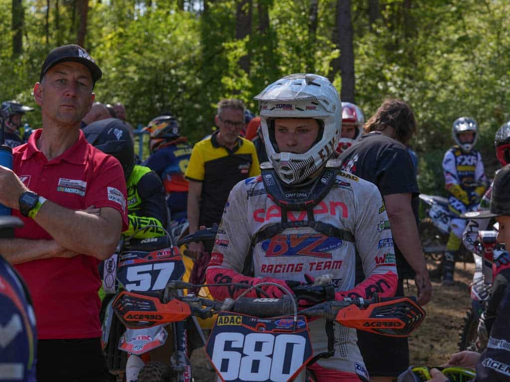 Für meinen ersten DM Lauf reiste ich nach Genthin und dort hatte ich ein richtig cooles Wochenende. Erstmals war unser BVZ Enduro Team gemeinsam auch beim Motocross unterwegs. So reiste auch ich schon am Freitag an, um meine Teamkollegen und meinen Großcousin Martin zu unterstützen. Der war extra aus Andorra angereist, um in der 85er Klasse an den Start zu gehen und ich konnte mir die Strecke am Samstag schon gut anschauen. Am Sonntag war ich dann an der Reihe und ging in der 125ccm Klasse der Deutschen Meisterschaft an den Start. Mein Highlight des Tages war das Zeittraining. Hier konnte ich die fünftschnellste Zeit setzen und sicherte mir so unter den 37 Startern eine optimale Startposition