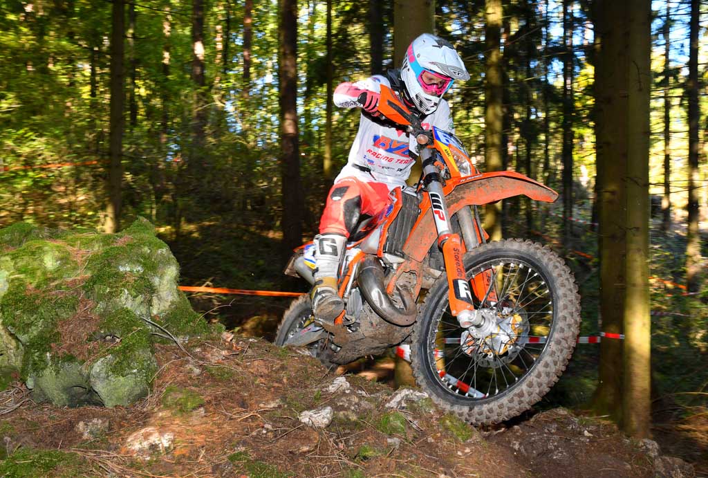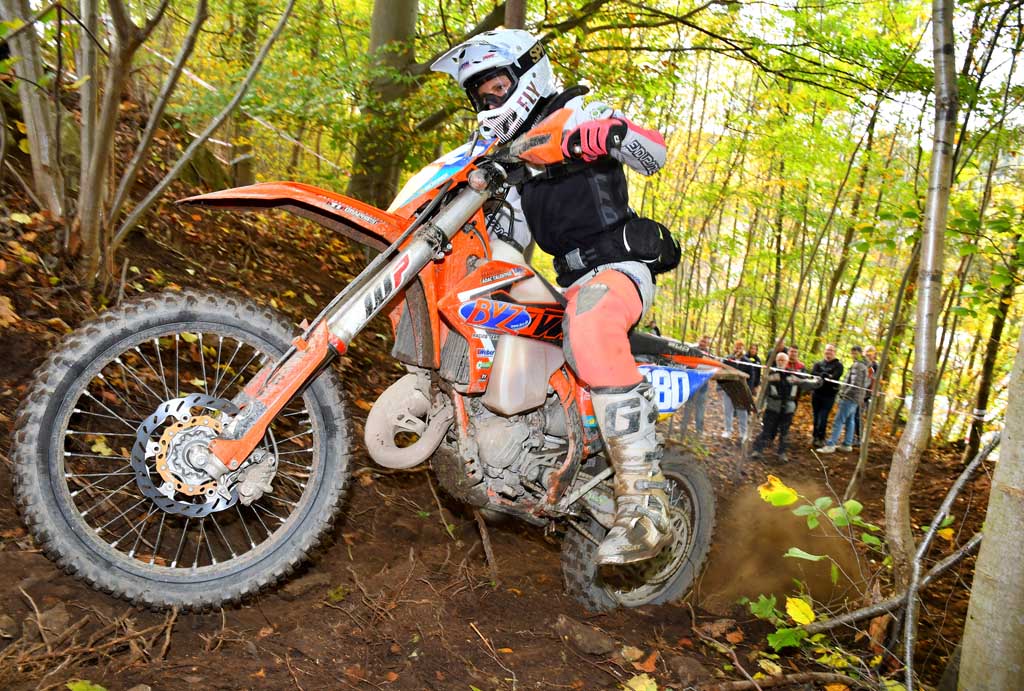 Das war noch einmal ein harter Kampf. Mit einem Vorsprung von 22 Punkten in meiner Klasse, dem Deutschen Enduro Jugend Cup reiste ich zum Finale nach Kempenich. Hier galt es also, „nur noch“ das Ziel zu erreichen und damit den Sieg in der Meisterschaft einzufahren. Im B-Championat dagegen sollte ich an diesem Tag mindestens den vierten Platz erreichen, um mir auch hier die Meisterschaft zu sichern. Noch aus dem letzten Jahr wusste ich, dass mir die Strecke nicht so gut liegt und so war es dann auch. Es fiel mir schwer an diesem Tag frei zu fahren und ich bin nicht so richtig in den Fahrfluss gekommen. So ging es beim Kampf um Platz zwei bis vier den ganzen Tag über richtig heiß zur Sache und blieb auch bis zur letzten Minute spannend.