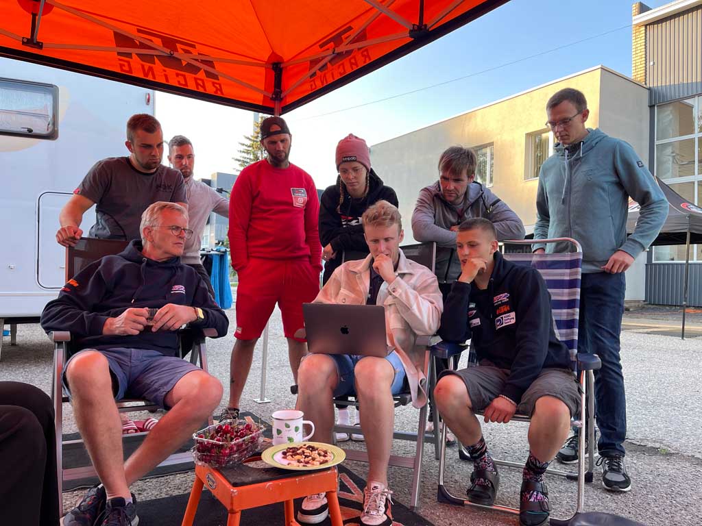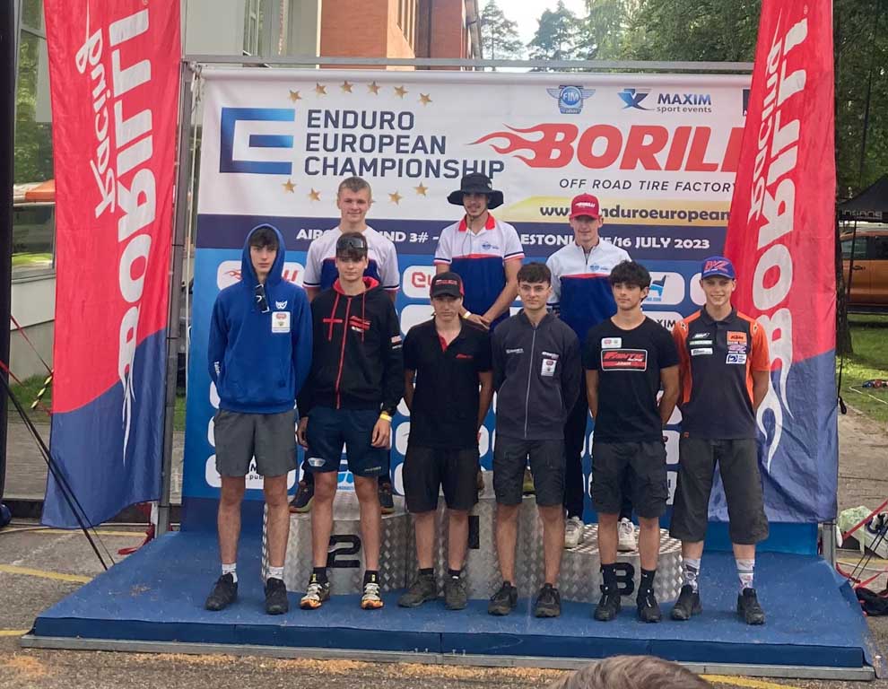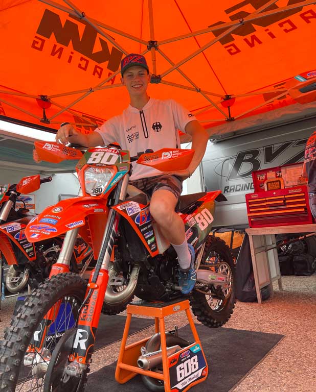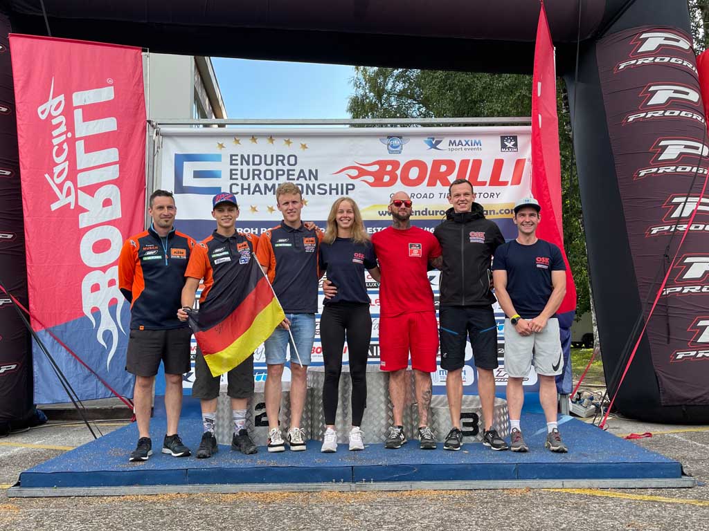 Nachdem wir mit unserem Wohnwagen 19 Stunden durch Polen, Litauen und Lettland gerollt waren, fühlten wir uns am Ziel in Paikuse/Estland angekommen, ganz wie zuhause im Spreewald. Flache Wiesen, sandige Wälder und tausende von Mücken. Sieben deutsche Fahrer waren zur Enduro EM angereist. Mit dabei waren diesmal auch Davide und Bert, so hatte ich Verstärkung und Unterstützung unter dem BVZ Pavillon. Wie immer waren wir alle, teamübergreifend eine coole Truppe „Made in Germany“. Auf und neben der Strecke waren wir alle gemeinsam unterwegs. Im Gegensatz zur Heimat hatten wir perfektes „Betreuerwetter“ und voll angenehme Temperaturen, auch für uns Fahrer. Drei Sonderprüfungen waren an je zwei Renntagen zu bewältigen, darunter eine lange Wiesenprüfung, ein Enduro Test mit teilweise schlammigen und moorigen Passagen und ein sandiger Crosstest, also genau mein Ding. Am ersten Tag hatte ich noch so meine Probleme mich einzufuchsen und die Franzosen und Italiener in meiner stark besetzten Klasse waren nicht einzukriegen. Am Ende aber fuhr ich nach Davide und Andy Beyer die drittschnellste Zeit unter den Deutschen Fahrern, womit ich dann doch ganz zufrieden war.
