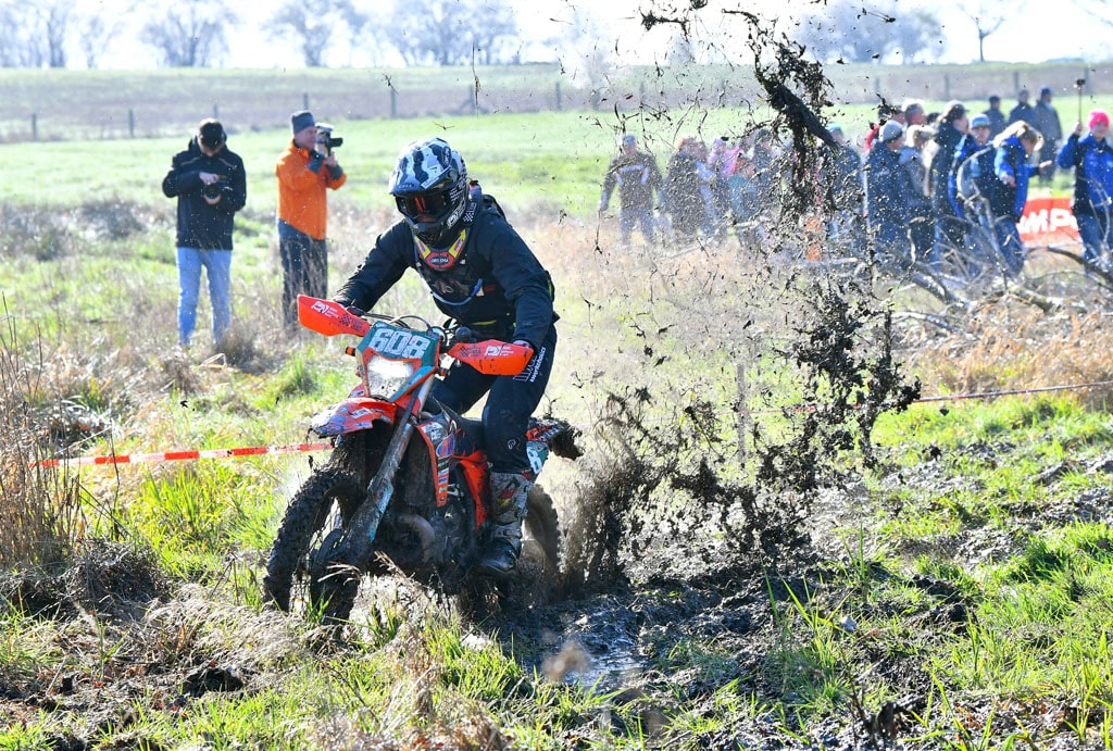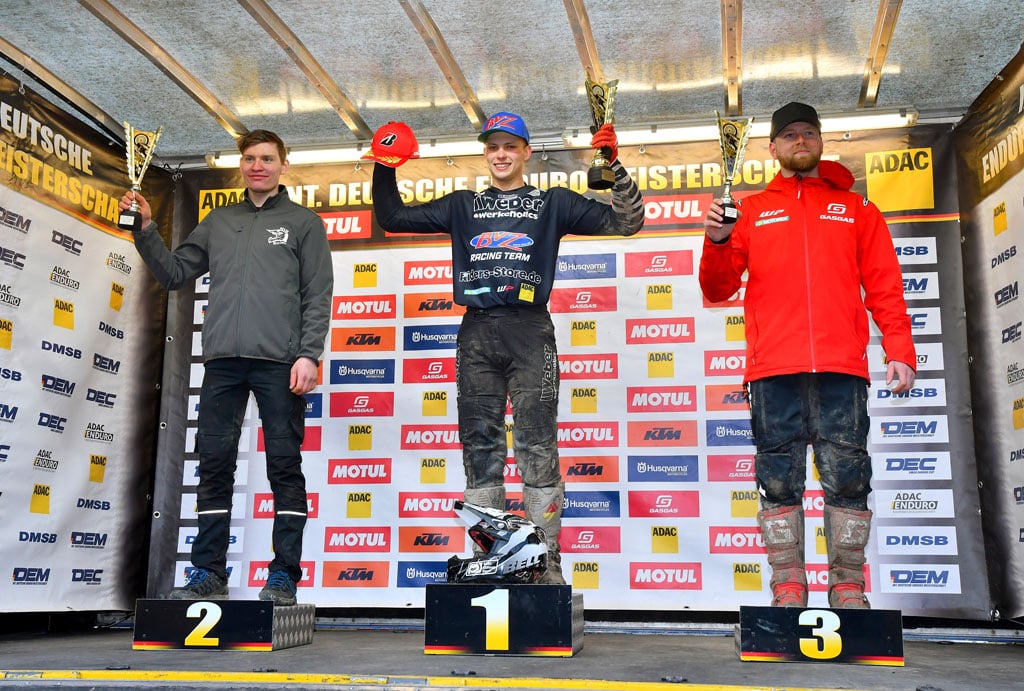 Der Renntag startete für mich gut und ich konnte gute Zeiten fahren. Nach der fünften Sonderprüfung, auf P15 im Championat liegend, hätte das Rennen für mich auch perfekt enden können. Doch dann wurden mir leider die schlammigen Bedingungen zum Verhängnis. Meine Gabel fing an zu sauen und gab schließlich ganz den Geist auf. Im Laufe des 8 ½ stündigen, extrem langen Renntages, hatte ich dann kein gutes Gefühl mehr auf dem Motorrad und stellte zudem auch noch fest, dass sich am hinteren Dämpfer, die fest eingeklebte obere Schraube gelöst und völlig verklemmt hatte. Da ließ sich nichts mehr drehen und das Motorrad war nicht mehr kontrolliert zu fahren. Im letzten Service musste ich dann auch noch meine verbogene Bremsscheibe wechseln. Es lief also alles andere als optimal für mich und ich büßte in den letzten Sonderprüfungen leider noch einige Plätze im Championat ein. Für den Sieg in meiner Klasse J2 hat es, als kleiner Trost trotzdem gereicht. Trotz allem aber war mal wieder festzustellen, dass es in Sachsen immer die treuesten Enduro Fans am Streckenrand gibt. Die Stimmung ist unschlagbar, ein großes Dankeschön dafür!