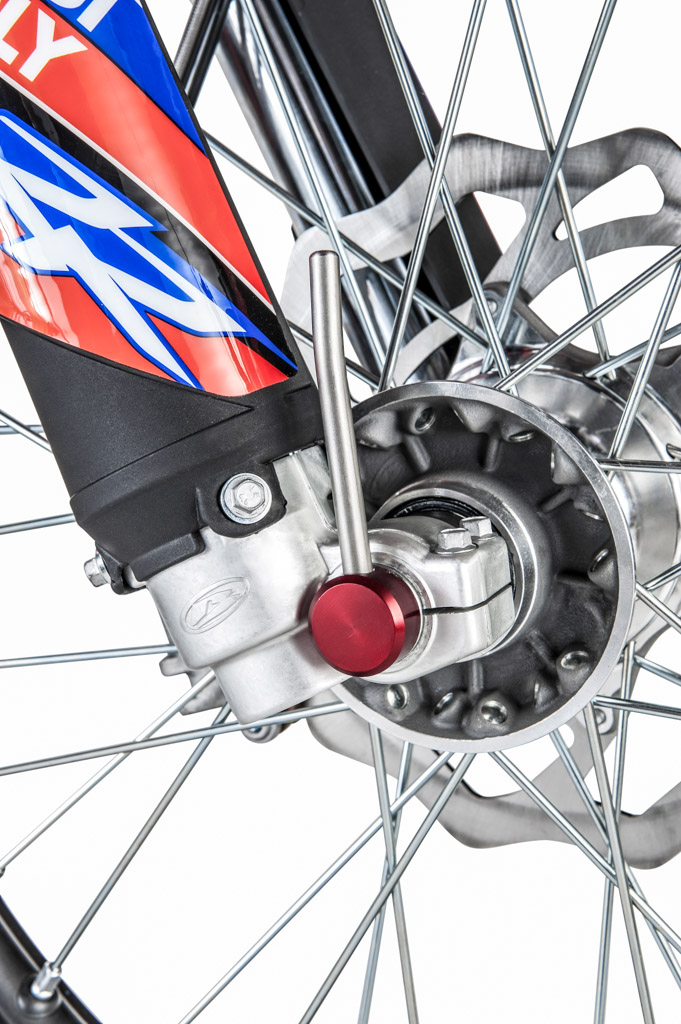 - Schnellmontagebolzen am Vorderrad. Dies ermöglicht eine schnellere Reparatur des Reifens, um im Wettkampf