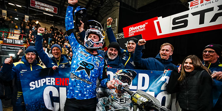 In der ausverkauften Utilita Arena sicherte sich Billy Bolt vor 10.000 Fans seinen sechsten Titel in der FIM SuperEnduro World Championship. Damit zieht der Husqvarna-Werksfahrer mit Rekordchampion Taddy Błażusiak gleich – ein echtes Ausrufezeichen in der SuperEnduro-Historie.