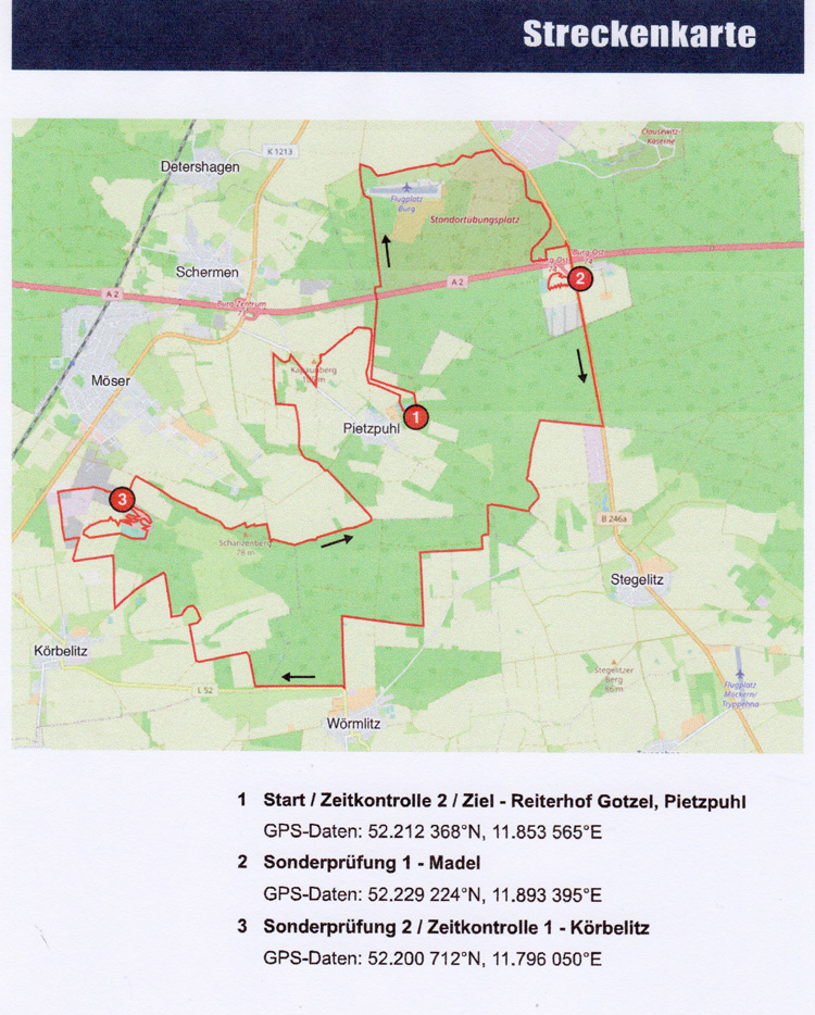 Die erste Sonderprüfung in Madel, direkt an der Autobahnausfahrt Burg Ost, wurde ordentlich aufgebohrt. Durch einige zusätzliche Ackerabschnitte ist sie deutlich länger als zuvor. Die zweite Sonderprüfung in Körbelitz setzt neue Maßstäbe: Die ohnehin schon lange Strecke auf dem bewaldeten Vereinsgelände wurde nochmals ausgeweitet und führt jetzt über die angrenzenden Felder bis zur benachbarten Sandgrube. Die Prüfungszeit wird aktuell mit über zehn Minuten veranschlagt – laut Fahrtleiter Wilfried Meine sind aber auch zwölf Minuten durchaus möglich. Da heißt es, Kondition und Konzentration bis zum letzten Meter zu bewahren!