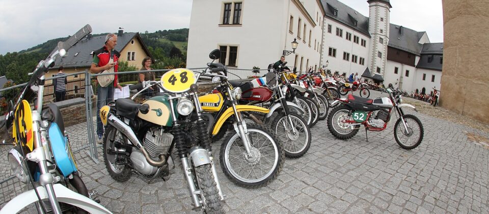 Bei der Technischen Abnahme am Freitag Abend war auf dem Schlosshof noch eitel Sonnenschein. Warme Temperaturen stimmten alle Klassiker für den Samstag optimistisch. Leider sollte dies aber für den Renntag anders werden. Kräftige Schauer erschwerten die Bedingungen für die alten Motorräder. Der Skihang musste sogar leicht modifiziert werden.
