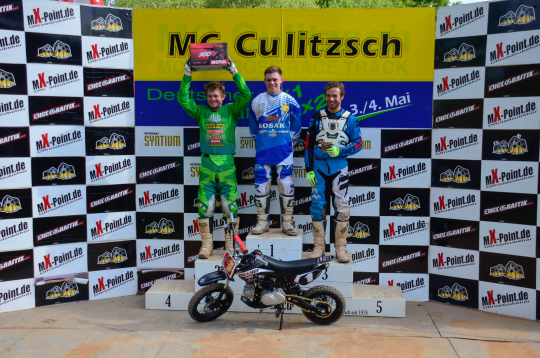 Insgesamt 107 Fahrer sind beim 48. Culitzscher Motocross an den Start gegangen. Rund 500 Zuschauer – deutlich mehr als im vergangenen Jahr – erlebten am Wochenende Packende Rennen auf der gut präparierten Strecke. Für den Deutschen MX-2-Pokal hatten 67 Fahrer gemeldet, und so musste in zwei Gruppen gefahren werden. Im ersten Zeittraining der Gruppe A legte Marco König aus Ansbach die schnellste Zeit vor. Lokalmatador Danny Neubauer aus Cunersdorf nahm die Herausforderung an und konterte in seiner Gruppe mit einer neuen Bestzeit. Im Halbfinale ging es richtig zur Sache. Schließlich wollte jeder unter die 20 besten Fahrer kommen, um sich fürs Finale zu qualifizieren. Das erste Halbfinale gewann Marko König vor Hannes Herbst und Joey Rock. Im zweiten Halbfinale erwischte Danny Neubauer keinen guten Start und wurde etwas eingeklemmt. Doch er gab nicht auf und wurde nach 15 Minuten Renndistanz noch Dritter. Nur Moritz Schittenhelm und Tom Koch waren dann allerdings schon zu weit weg. Im Finale starteten Marko König, Moritz Schittenhelm und Hannes Herbst von den besten Positionen. Danny Neubauer musste mit dem sechsten Startplatz vorliebnehmen. Der Lokalmatador wurde abermals in der Startkurve eingeklemmt und kam nur im Mittelfeld aus der ersten Runde zurück. Er kämpfte sich Meter um Meter nach vorn, aber die zwei Führenden legten ein enormes Tempo vor und hatten zudem freie Fahrt. Neubauer kam leider nicht mehr an die beiden heran. Hinter Marko König und Jonas Wolf fuhr Danny Neubauer als Dritter über die Ziellinie.