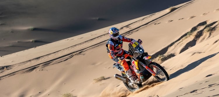 Der amtierende Champion Toby Price hatte mit seiner ersten Startnummer die vorteilhafte Position, als 23. Fahrer die Tagesetappe zu betreten. Der Aussie-Star drängte vom Start weg sofort mit der zweitschnellsten Zeit auf den ersten Wegpunkt. Ein kleines Problem mit seiner Navigationsausrüstung schien Toby das Tempo zu drosseln, da ein beschädigtes Roadbook die Navigation erschwerte. Glücklicherweise konnte er sich auf den Rückendeckung seines Teamkollegen Walkner setzen und die beiden brachten ihre KTM 450 RALLY-Maschinen sicher und rechtzeitig nach Hause, mit Price als schnellstem Gesamtfahrer.