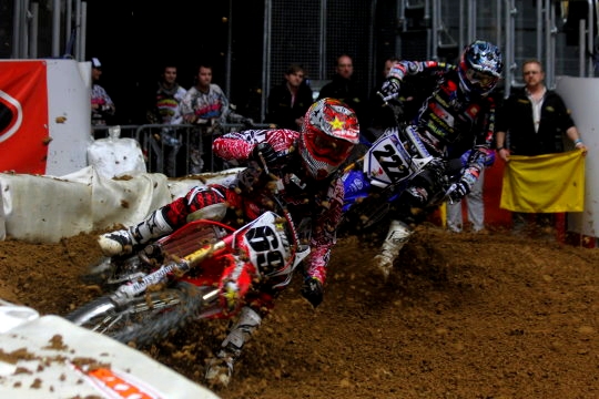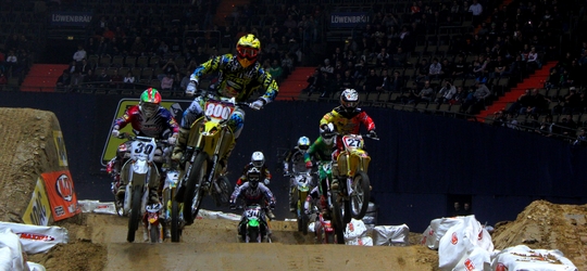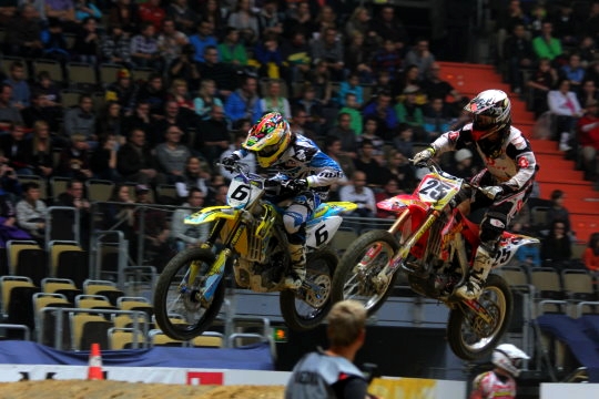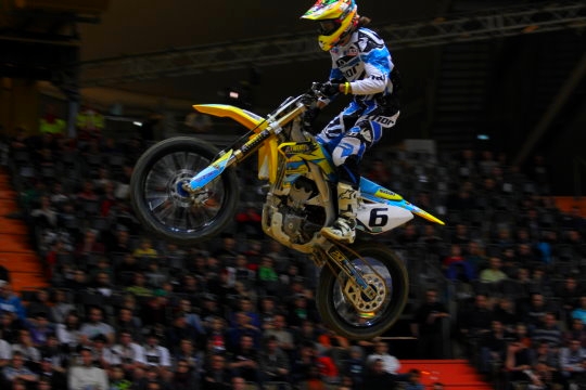 Nach der glänzenden Vorstellung am Samstag dreht der US-Amerikaner Mike Alessi erneut kräftig am Gas. Er siegte sourverän im ersten Qualirace. In den Qualifikationsläufen A,B und C kommen immer die besten 6 Fahrer der SX1 Klasse ins Halbfinale. Durch die beiden Hoffnungsläufe haben jeweils 2 Fahrer die Chance auf einen Platz im Halbfinale. Leider nicht mehr am Start der schnellste deutsche Supercrosser Daniel Siegl. Nach einem heftigen Sturz im Samstagsfinale wurde er mit einem Jochbeinbruch ins Klinikum gebracht. Siegl wurde auch schon operiert und es geht Ihn den Umständen entsprechen gut. Gute Besserung Dani.