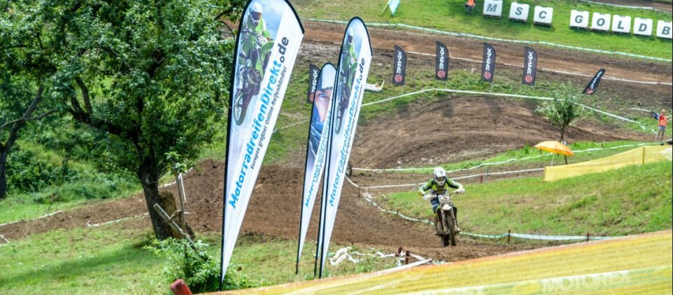 Delticom AG/MotorradreifenDirekt.de, Hannover – 29.07.2016. Hitzeschlacht im unterfränkischen Goldbach: Das vierte Rennwochenende der German Cross Country Championship (GCC) am 23. und 24. Juli auf der beliebten Traditionsstrecke bei Aschaffenburg stellte die Ausdauer von Mensch und Maschine auf die Probe. Bei schwülen 30 Grad erkämpfte sich das Team von MotorradreifenDirekt.de am Sonntag respektable Plätze, musste aber auch den Witterungsbedingungen Tribut zollen – Motocross ist eben kein Spazierenfahren. Auf die Pirelli-Reifen der Scorpion-MX-Palette, auf denen das Team seit 2014 unterwegs ist, war jedoch wie gewohnt Verlass.