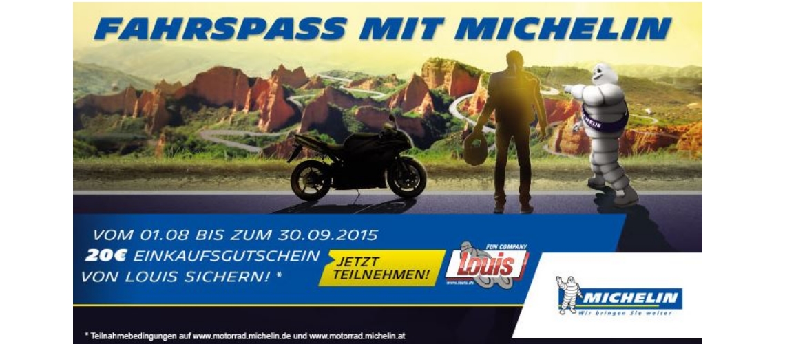 MICHELIN-Aktionen: Bis einschließlich 30. September bekommen Käufer eines Satzes MICHELIN Motorrad- oder Rollerreifen (Vorder- und Hinterreifen) einen 20-Euro-Einkaufsgutschein des renommierten Biker-Ausstatters LOUIS gratis dazu. Teilnehmer erhalten ihre Einkaufsgutscheine innerhalb von sechs Wochen (auf dem Postweg). Der LOUIS-Gutschein ist sofort einlösbar, zwei Jahre gültig und an keinen Mindesteinkaufswert gebunden.