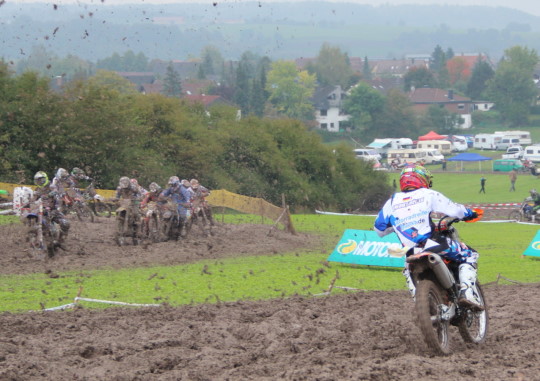 Hannover, 15.10.2013. Spannende Schlammschlacht: Beim Finallauf der deutschen Cross-Country-Meisterschaft (GCC) am 5. und 6. Oktober war Benedikt Müller mit hohen Erwartungen gestartet. Der Junioren-Pilot enttäuschte weder sich noch sein Team: Mit seinem überzeugenden Sieg in den schlammigen Kurven von Bühlertann konnte Benedikt seine Führungsposition behaupten und steht – auch nach Abzug des hohen Streichergebnisses von 20 Punkten – mit 159 Punkten als Meister seiner Leistungsklasse fest. Für das 23-jährige Offroad-Talent war es ebenso die erste GCC-Saison wie für sein Team von MotorradreifenDirekt.de, dem Zweiradspezialisten der Delticom, Deutschlands führendem Online-Reifenhändler.
