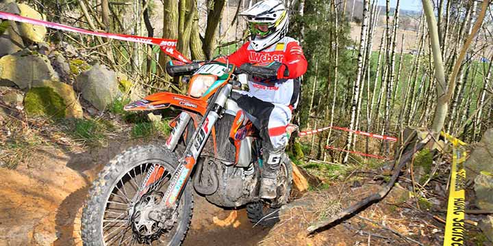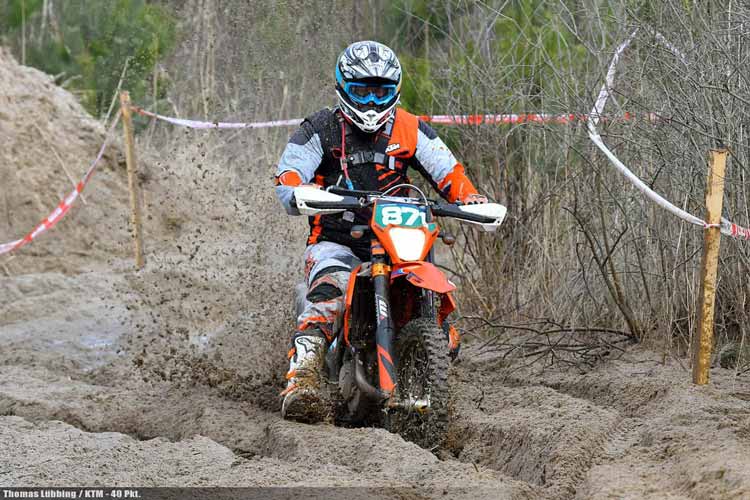 Allen voran Mario Grimm. Der KTM-Fahrer ist ein wahrer Dauerbrenner, der u.a. schon bei den Six Days 1987 in Polen am Start war. Dass er von seinem Können nichts eingebüßt hat, beweist der mittlerweile 55-Jährige immer wieder auf´s Neue. Und auch beim Saison-Einstand in Tucheim war der Titelverteidiger wieder eine Klasse für sich und gewann mit knapp eineinhalb Minuten Vorsprung auf KTM-Fahrer Torsten Holz. Auf den Rängen drei und vier folgten die Markenkollegen Thomas Lübbing und Stefan Müller. Das Terrain in Dahlen sollte Mario Grimm als ausgemachten Sandspezialisten jetzt nicht unbedingt in die Karten spielen. Die Chance für seine Kontrahenten? In der Tat! Vor allem Stefan Müller packte die Chance beim Schopfe und lag nach der ersten von insgesamt zwei Runden knapp vor dem Titelverteidiger in Front. Doch dann blies Mario Grimm zur Aufholjagd und entriss dem Vorjahres-Vize in der letzten Prüfung doch noch den Tagessieg. Lediglich 8,20 Sekunden machten am Ende den Unterschied zwischen den beiden KTM-Fahrern. Das Podium bei „Rund um Dahlen komplettierte Thomas Lübbing, der im Vorjahr noch bei den Senioren am Start war. Diese drei Herren bilden zudem die Top Drei in der Gesamtwertung im Super-Senioren-Cup, gefolgt von Torsten Holz, Enrico Ryl und Peter Baltruweit.
