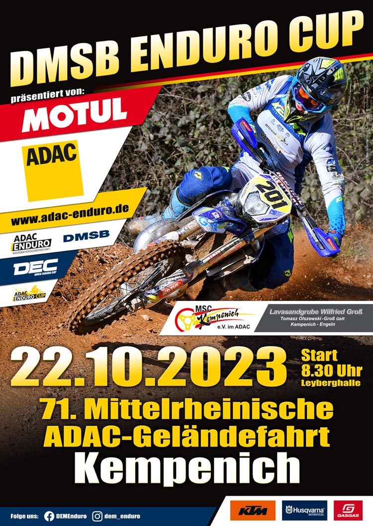 Nur eine Woche nach dem packenden DEM-Finale in Zschopau steht in Kempenich der DEC-Saisonabschluss an. Und hier gibt es eine Besonderheit: „Alles bleibt beim Alten, nur dass wir dieses Jahr die Strecke andersherum fahren“, sagt Fahrtleiter Ralf Caspers. Die Veranstaltung wird wie immer in enger Zusammenarbeit zwischen dem ADAC Mittelrhein e.V. und dem MSC Kempenich e.V. im ADAC organisiert.
