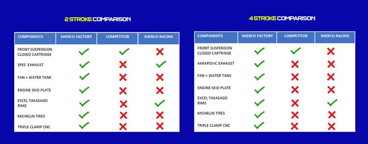 Einer der größten Unterschiede zu den Factory-Modellen liegt in der Auswahl der verbauten Komponenten. Um den Preis der Racing Modelle attraktiver zu gestalten, hat Sherco bei den 300 SE und 300 SEF auf einige der teureren Bauteile verzichtet, ohne dabei die Qualität und Leistungsfähigkeit zu kompromittieren.