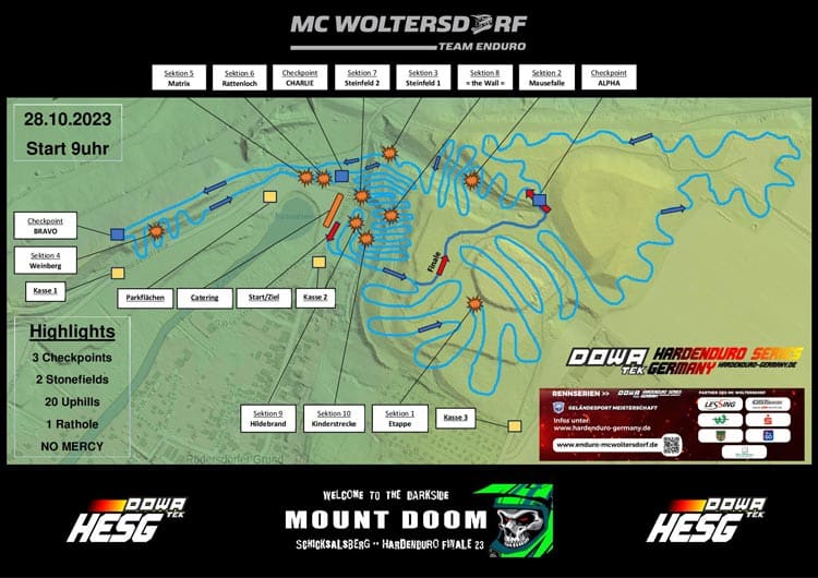 Für die besten deutschen Hardenduro-Fahrer wird die Strecke sogar noch erweitert. Neue, bisher unberührte Auffahrten werden in die Strecke integriert. Zum großen Finale stehen insgesamt 20 verschiedene Auffahrten zur Verfügung. Aber das ist noch nicht alles: Zusätzlich gibt es zwei Steinfelder und einige künstliche Hindernisse, die die Fahrer auf Trab halten werden.