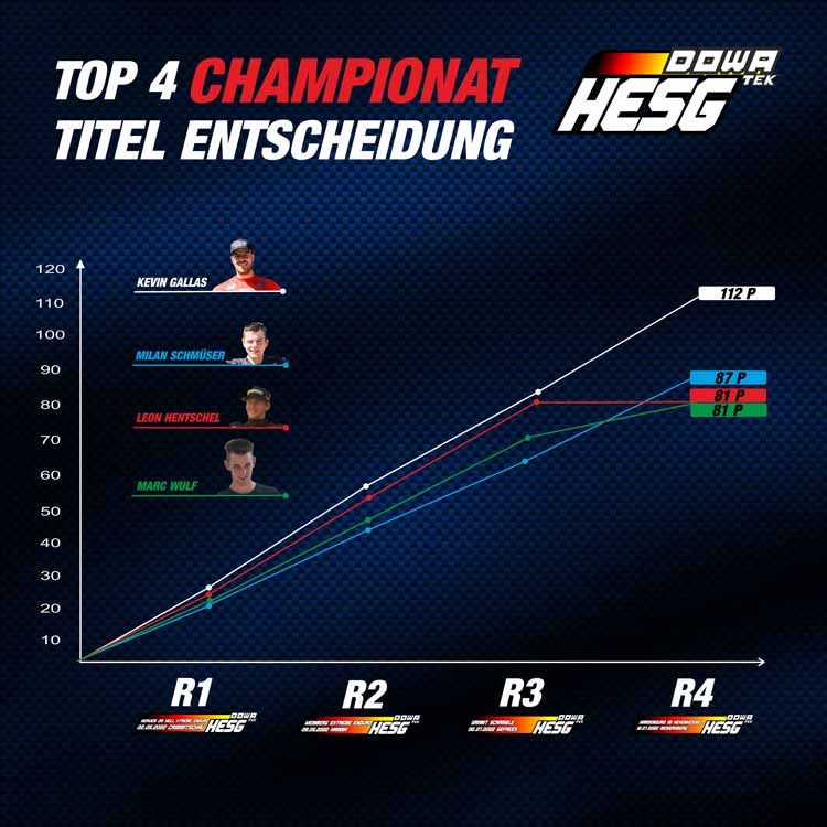Schmüser hingegen benötigt nur noch einen siebten Platz um bei den Junioren den Titel vorzeitig zu sichern. Kevin Gallas reicht die gleiche Platzierung in der PRO Klasse. In allen anderen Wertungen ist der Kampf um den Titel weiterhin bis zum Finale offen.