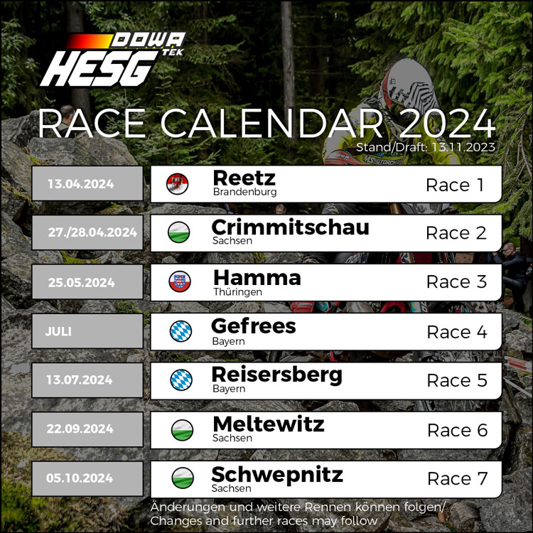 Der Termin in Gefrees sowie ein möglicher achter Termin stehen noch aus. Serienchef Denis Günther beschreibt die Terminfindung für 2024 als besonders herausfordernd. Schwierigkeiten ergeben sich vor allem durch die Feiertage im Mai und den vollen Kalender im Frühjahr und Herbst. Überschneidungen mit internationalen Events wie der FIM Hardenduro WM und dem Enduro Panorama sollen vermieden werden, um Konflikte für teilnehmende Fahrer zu vermeiden. Die endgültigen Termine werden bald bekannt gegeben.