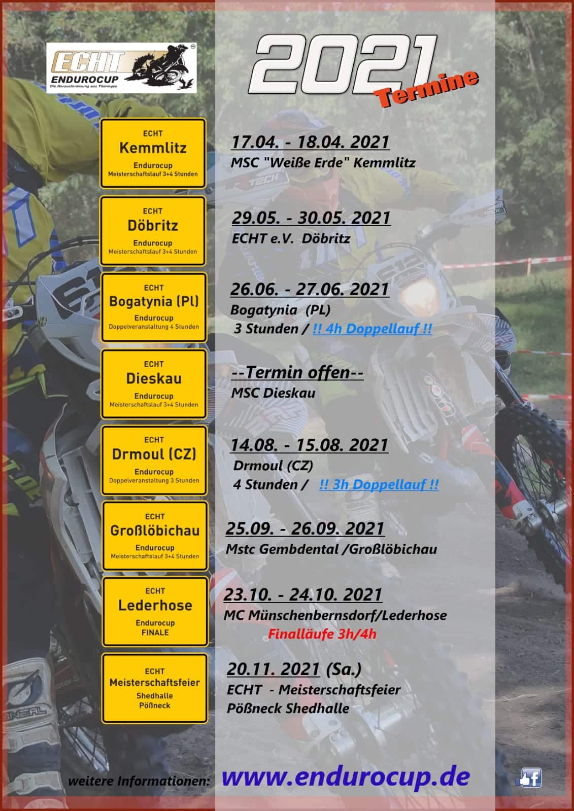 Der ECHT ENDUROCUP hat seine Termine für die Saison 2021 bekannt gegeben. Insgesamt 8 Veranstaltungen, darunter auch wieder ein Lauf in Polen und in der Tschechei sind geplant.