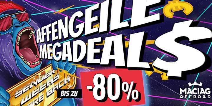 *Werbung* Bei Maciag Offroad sind die SENDERWEEKS mit absoluten Skandaldeals zurück! Ab 4. November bekommst Du 2 Wochen lang geballte Prozent-Power auf über 3.500 Produkte nur so um die Ohren gehauen. Dabei gibt‘s bis zu wahnsinnige 80% Rabatt (kein Scherz) auf Gear & Technik aus dem größten MX- & MTB-Sortiment Europas.
