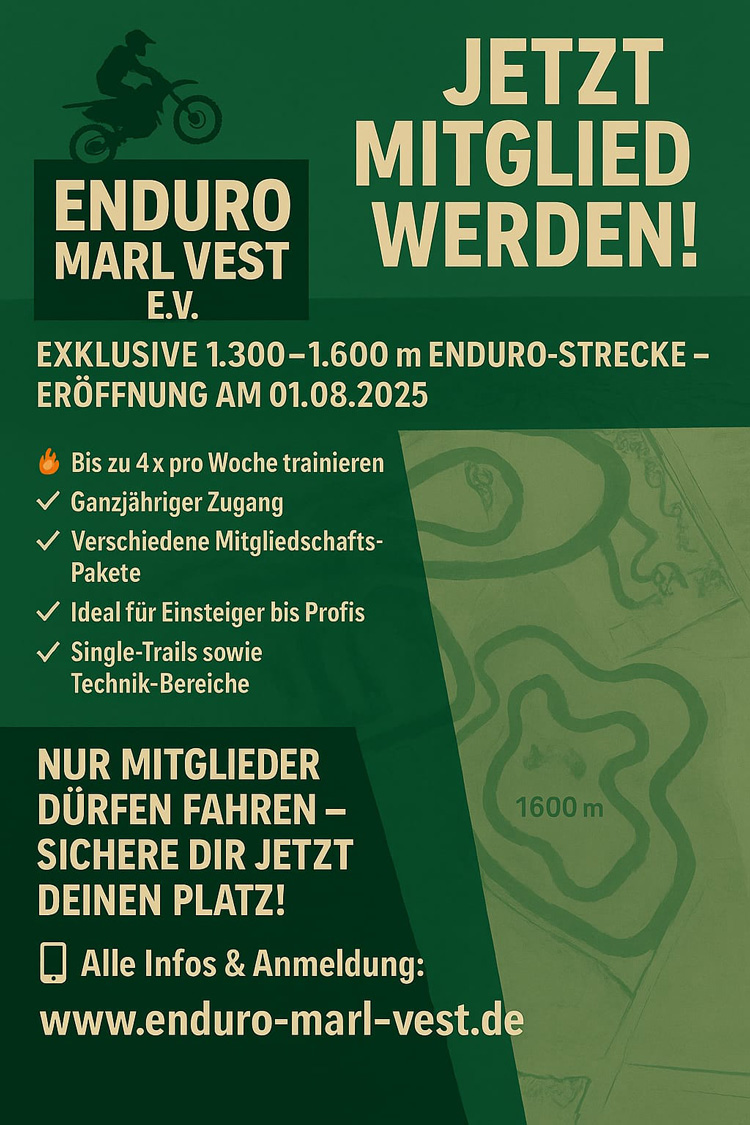📢 „Wir wollen einen Ort schaffen, an dem sich Fahrer frei entfalten können – ohne Risiko, ohne Ärger, aber mit Respekt für die Natur.“ – Enduro Marl (Vest) e.V.