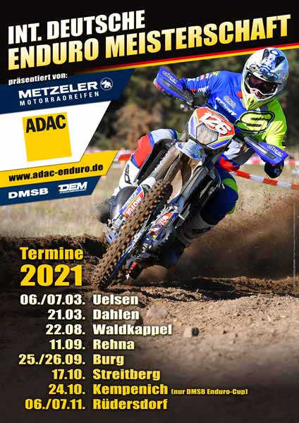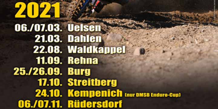 Die Internationale Deutsche Enduro Meisterschaft 2021 wird heute auf den Tag genau in vier Monaten mit der Zweitagesfahrt in Uelsen eröffnet. Noch im März folgt in Dahlen ein weiterer Lauf. Der Restart nach der obligatorischen Sommerpause findet in Waldkappel statt. Es folgen die Veranstaltungen in Rehna, Burg und Streitberg. Ausschließlich für die Teilnehmer des DMSB Enduro-Cup geht es nach Kempenich, bevor sich alle beim erneut zweitägigen Finale in Rüdersdorf bei Berlin treffen.