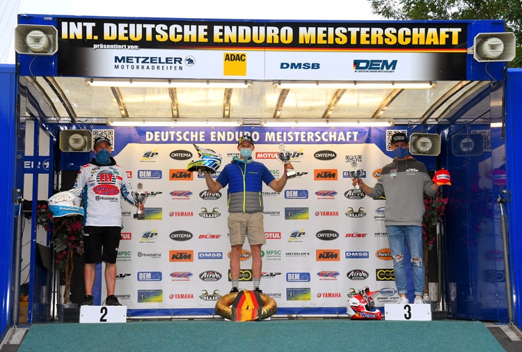 Das Podest der Tageswertung komplettierte Davide von Zitzewitz, der heute klar die dritte Kraft im Feld war. Eine halbe Minute Rückstand auf Schröter, dafür aber mehr als eineinhalb Minuten Vorsprung auf den Viertplatzierten Luca Fischeder, der seinerseits seine bis dato beste Platzierung im Championat bejubeln durfte. „Heute ging es mir leider nicht so leicht von der Hand, wie noch in Rehna“, berichtet Davide von Zitzewitz, „eigentlich mag ich die Strecke in Burg, von daher hatte ich mir doch ein klein wenig mehr ausgerechnet. Aber morgen ist ja auch noch ein Tag.“ Diese Ansicht vertritt auch Edward Hübner, der sehr schleppend in Tag fand, dann aber zur Aufholjagd blies und sich so noch bis auf Rang fünf vorarbeiten konnte. Dabei ließ er Robert Riedel knapp hinter sich, der diese Niederlage aber verschmerzen konnte. Viel wichtiger war dem KTM-Fahrer, dass er seinen ersten DEM-Tagessieg einfahren konnte. Zwar stand er bei den Junioren schon einmal ganz oben, jedoch noch nie in der E1. „Ich bin total glücklich und zufrieden“ strahlt der Klassensieger über das ganze Gesicht, „endlich habe ich die erste Runde einmal nicht verschlafen. Ich konnte von Beginn an richtig pushen und habe mich auch so rundum gut gefühlt. Es war ein super Tag, richtig geil!“