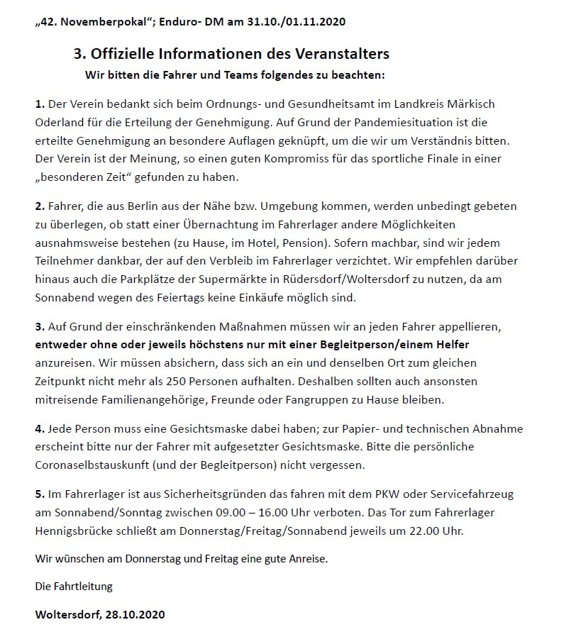 Wie der ausrichtende MC Woltersdorf e.V. im ADMV gestern Abend mitteilte, liegen –Stand jetzt– alle erforderlichen Genehmigungen zur Durchführung der Enduro-Veranstaltung „Novemberpokal 2020“ vor. Die Orga-Leitung des brandenburgischen Motorsportclubs bestätigte zudem ausdrücklich vollste Bereitschaft, das DEM-Finale trotz aller Widrigkeiten, wie geplant über beide Wertungstage, jedoch angepasst und unter Berücksichtigung der gesetzlichen Regelungen und Hygiene-Maßnahmen, durchzuziehen.