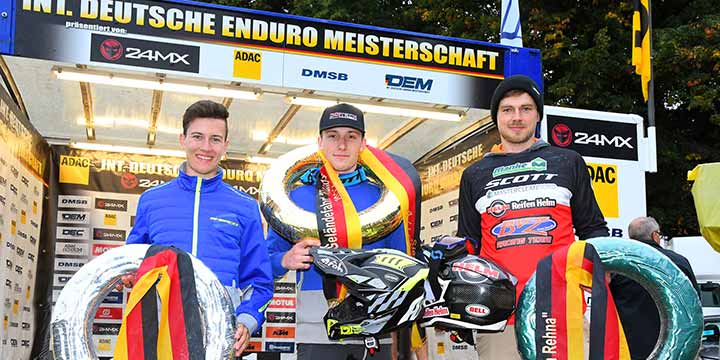 Deutschlands aktuell schnellster Enduro-Fahrer untermauerte in Rehna seine derzeitige Vormachtstellung mehr als eindrucksvoll. Nicht nur, dass Luca Fischeder den Championatssieg holte, nein, er sicherte sich auch in jeder einzelnen Sonderprüfung die absolute Bestzeit! Damit hatte der Sherco-Fahrer am Ende, bei einer Gesamtprüfungszeit von einer knappen Stunde, deutliche 53 Sekunden Vorsprung auf den ersten Verfolger. Und dieser war sein Teamkollege und Newcomer Jeremy Sydow, der mit dem zweiten Rang einen sehr starken DEM-Einstand gab. Das Podest komplettierte, sehr zu Freude des gastgebenden MC Rehna e.V. im ADAC, Vereinsfahrer Tilman Krause. Für den KTM-Fahrer ein traumhafter Tag, der zum ersten Mal überhaupt als Dritter in die Top Drei des Championats fuhr.