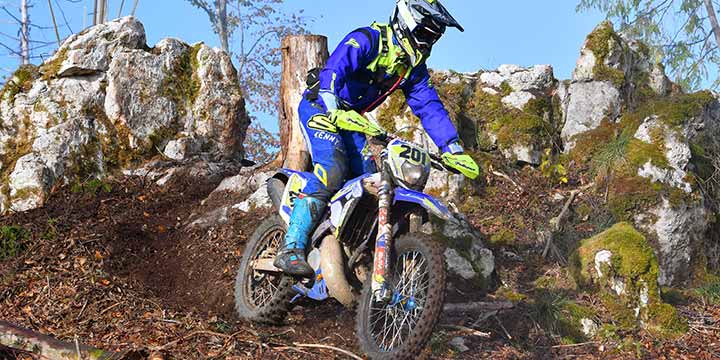Nach den gestrigen, sehr unglücklichen Umständen, die zum Abbruch des Prologes führten, konnte heute nun endlich das, von allen so erhoffte und lang herbei gesehnte Enduro-Fest in der Fränkischen Schweiz starten! Und wie es sich für ein rauschendes Fest gebührt, gehört auch ordentlich Tam-Tam und Feuerwerk dazu. Und das brannte Luca Fischeder schon in der ersten Prüfung ab, als er auf der von Raureif überzogenen Strecke mit einer spektakulären Fahrt die Bestzeit markierte. Auch in den anschließenden beiden Tests der erste Runde war der Sherco-Fahrer jeweils der Schnellste. „Ja, da habe ich den Grundstein für meinen heutigen Sieg gelegt“, analysiert der 23-Jährige, „ich habe über den Tag einen guten Fluss gefunden und immer kräftig gepusht. Bis zur ersten Prüfung der dritten Runde. Da habe ich mir den Fuß etwas unsanft unter dem Motorrad verklemmt. Von da an habe ich etwas ruhiger gemacht, aber dennoch genügend attackiert.“ Die Taktik ging auf. Am Ende gewann Luca Fischeder mit einer knappen Minute Vorsprung auf seinen Teamkollegen Jeremy Sydow. Platz drei ging an den erneut starken Tilman Krause.
