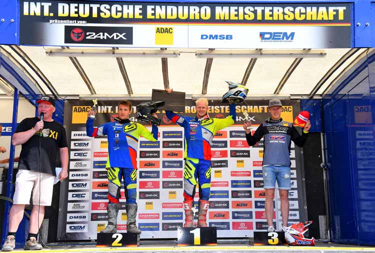 Das Podest wurde erneut von Davide von Zitzewitz komplettiert, der einen wesentlich zufriedeneren Eindruck, als noch am Samstag machte. „Heute bin ich nicht gestürzt, das ist doch was“, strahlt der KTM-Fahrer, der dennoch zugab, dass das Enduro-Sprint-Format für ihn doch ein wenig ungewohnt war. „Es war eine interessante Erfahrung. Aber jetzt freue ich mich schon auf die Veranstaltungen in Waldkappel und Rehna, die ich beide vom Terrain her sehr mag.“ Platz vier sicherte sich Edward Hübner, der heute wie ausgewechselt fuhr, Rang fünf ging an Chris Gundermann, der nachdrücklich bewies, das seine Formkurve weiterhin steil nach oben zeigt.