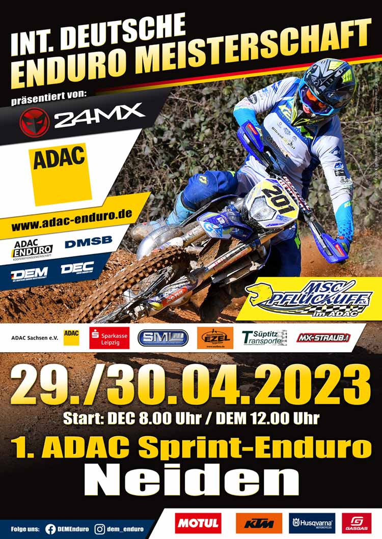 In unregelmäßigen Abständen hielt das Sprint-Enduro immer wieder einmal Einzug in die DEM, zuletzt 2020 in Meltewitz. Dabei wurde jedoch immer nur eine einzige Prüfung mehrmals gefahren. In Neiden allerdings wird es zum ersten Mal zwei verschiedene Tests geben! Einen längeren auf dem vereinseigenen Gelände unmittelbar am Fahrerlager sowie einen kürzeren auf der nur wenige Kilometer entfernten Motocross-Strecke in Elsnig. Die Streckenlänge wird mit 20 Kilometern (inkl. der beiden Sonderprüfungen) angegeben. Im DEC sind pro Tag ab 8 Uhr sieben Durchgänge zu absolvieren, in der DEM pro Tag ab 12 Uhr acht Runden.