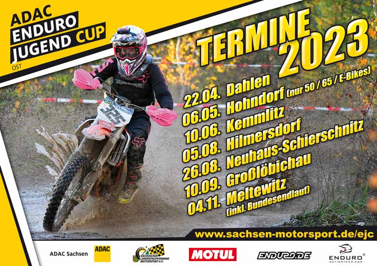 In 2023 kehrt der Enduro Jugend Cup Ost (EJC) mit sieben Veranstaltungen auf die Endurostrecken im Osten zurück. Von Mitte April bis Anfang November heizen die jungen Teilnehmerinnen und Teilnehmer, im Alter zwischen sechs und sechzehn Jahren, wieder über die matschig bis steinigen Piste. Der Auftakt findet am 22. April im nordsächsischen Dahlen statt. Hier ging der EJC im vergangenen Jahr zu Ende. Beim zweiten Lauf in Hohndorf bei Zschopau am 6. Mai gehen ausschließlich die Jüngsten der Kategorien 50, 60 und Elektro-Bikes an den Start.