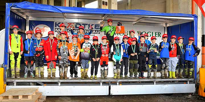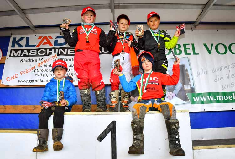 Insgesamt 13 Runden mussten die 24 Teilnehmer der Klasse 65 ccm meistern. Ein ordentliches Pensum, bei dem auch das zügige Fahren, auf der mittlerweile abgetrockneten Etappe, nicht vernachlässigt werden durfte. Diese Aufgabe löste Franz Flieger am besten. Er schaffte alle Durchgänge und glänzte zudem mit starken Sonderprüfungszeiten. Platz eins für den Kolkwitzer, der sich zudem über seinen ersten Sieg in dieser Kategorie freuen durfte. Zweiter wurde Jordan Wittenberg aus Letschin. Platz drei ging an den Dahlener Robin Fleischer. Nils Lindner (Zeulenroda-Triebes), Chris Müller (Krumhermersdorf) und Friedrich Roick (Großräschen) belegten die Plätze vier bis sechs. Auftaktsieger Lou Wohlhaupt aus Arnstein wurde von technischen Problemen kurzzeitig ausgebremst und belegte mit schnellen Zeiten in den Tests, sowie zwölf absolvierten Runden, dennoch Rang sieben.