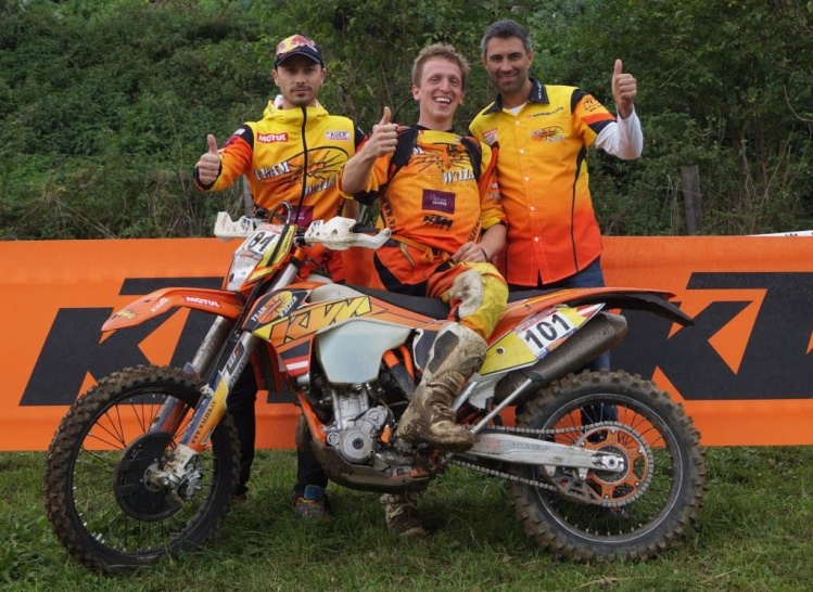 Daniel: „Meine neue 250iger Walzer KTM, die ich erst das zweite Mal bei einem Rennen eingesetzt habe, ist wieder richtig gut gegangen. Nach dem Startschuss und dem Start in Le Mans Manier, konnte ich als fünfter des gesamten Starterfeldes in die erste Kurve biegen. Bereits nach einigen hundert Metern wurde ich aber durch eine Kollision der vor mir fahrenden Racer etwas eingebremst. Mein Mitstreiter Craigher Dominikus konnte an mir vorbei gehen und blieb das restliche Rennen knapp vor mir. Ich konnte einen sicheren 2. Platz in der Tageswertung nach Hause fahren. Diese Platzierung reichte mir locker für den Gesamtsieg in der E1 Klasse und ich wurde im Ziel mit einer ordentlichen Sektdusche empfangen. In meiner erst dritten Rennsaison und in der ersten Saison im Team KTM Walzer könnte ich mit diesem Ergebnis nicht glücklicher sein! Vielen Dank an alle die mich in dieser Saison unterstützt und angefeuert haben, allen voran meiner Freundin und Betreuerin Anna und natürlich auch meinem Teamchef Berni Walzer und dem gesamten Team!“